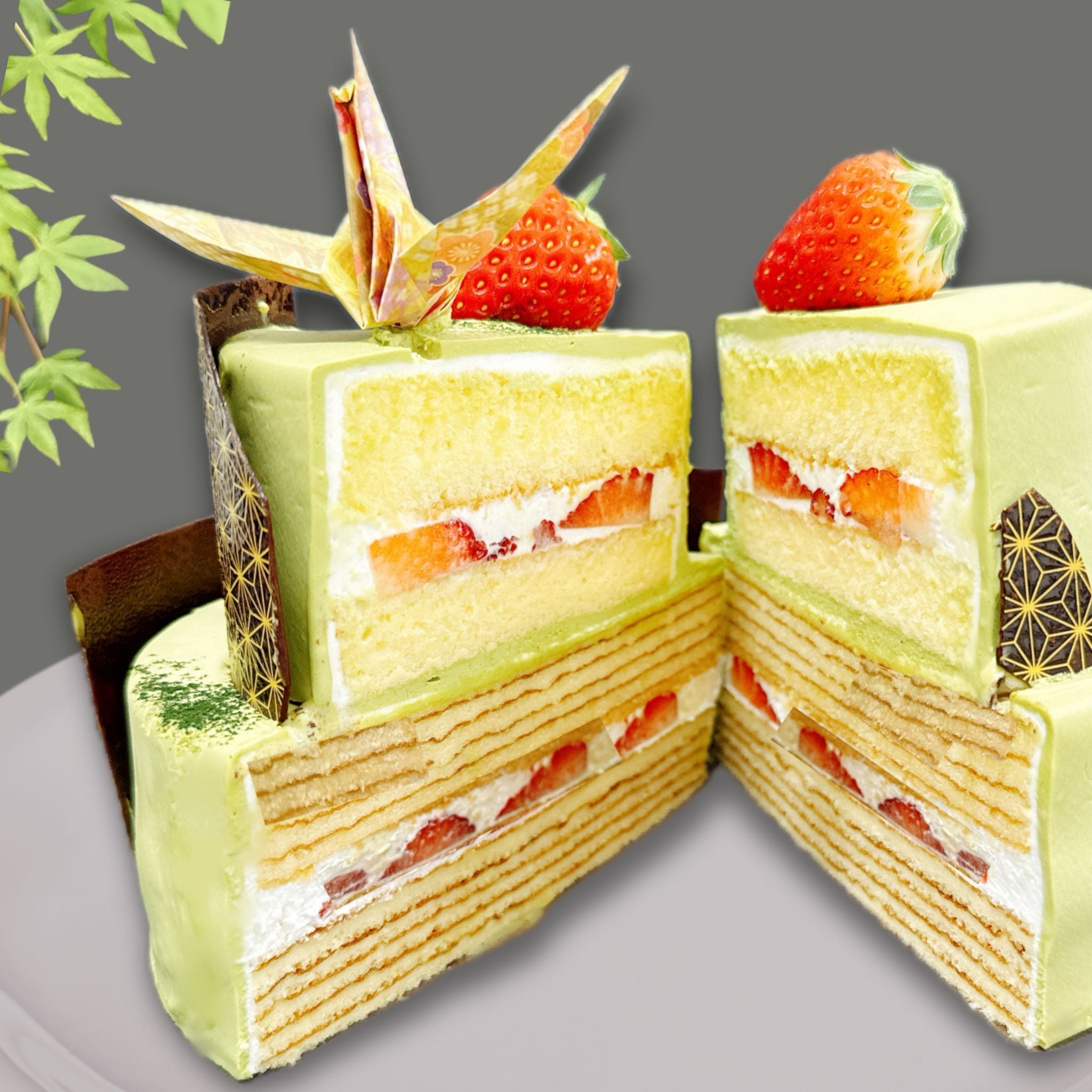 そこにたっぷりの苺をサンド。周りには、まろやかな抹茶のクリームを纏わせ、チョコレートパーツで上品にまとめた和モダンチックなケーキです。