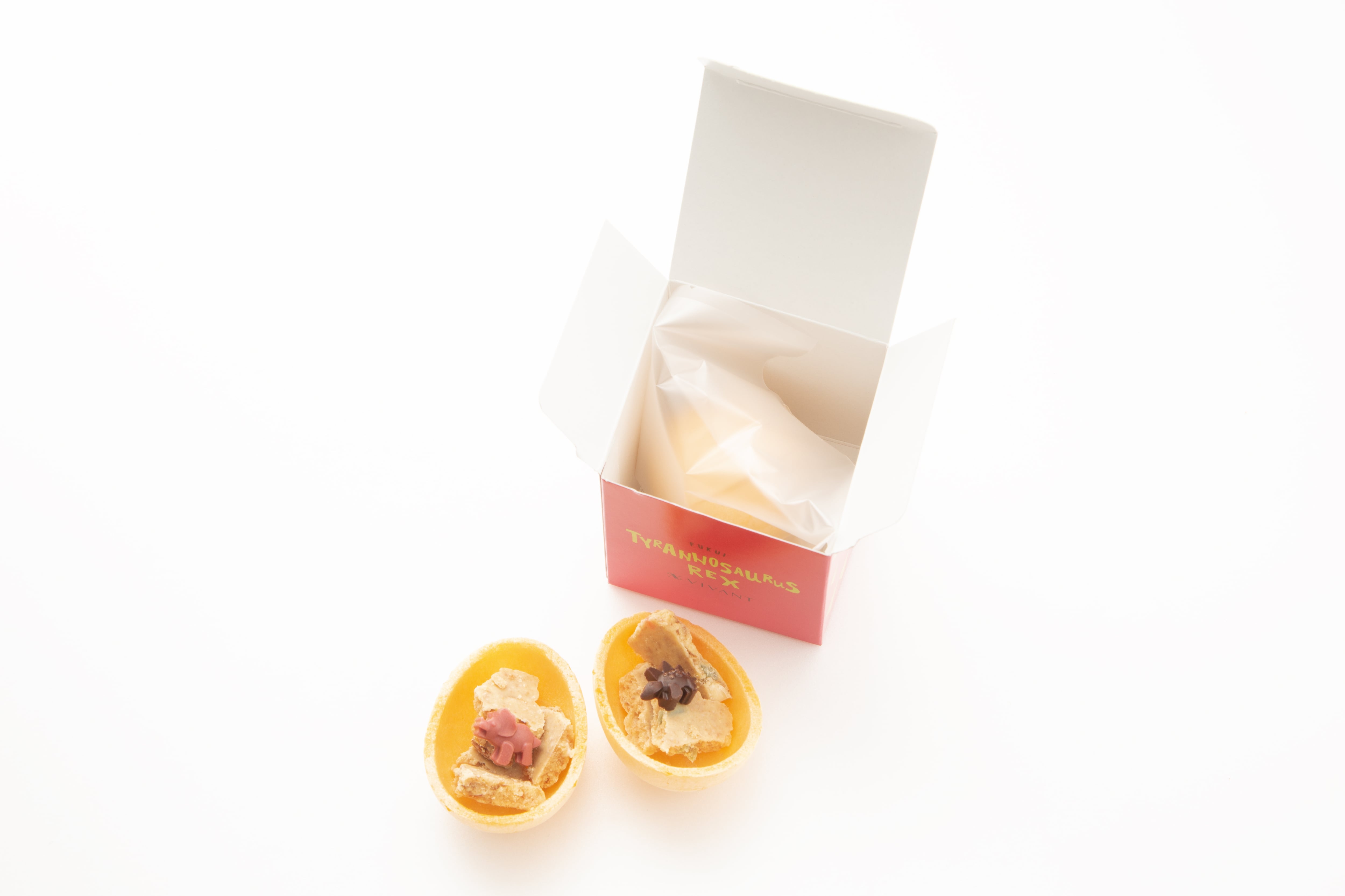 モナカの皮を割り、土に見立てたバウムクランチの中から恐竜のチョコを発掘してね!