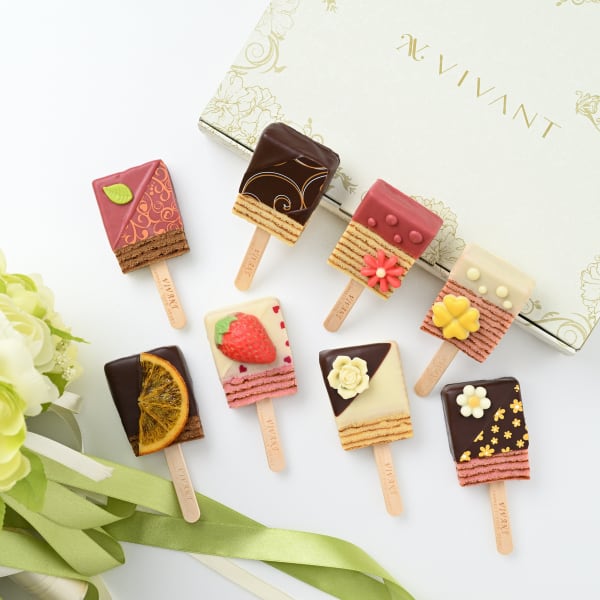 生地の素材を極めて薄く流し込み、各層均一の柔らかさを保ちながら緻密に仕上げる十六層の平焼きバウムクーヘン”IZAGUMO"の味わいに、チョコレートをたっぷりコーティングしたキャンディー型のバウムクーヘン。しっとりとした優しい口当たりに幸せ感が広がる、キュートで味わい深い"VIVANT BAR"です。